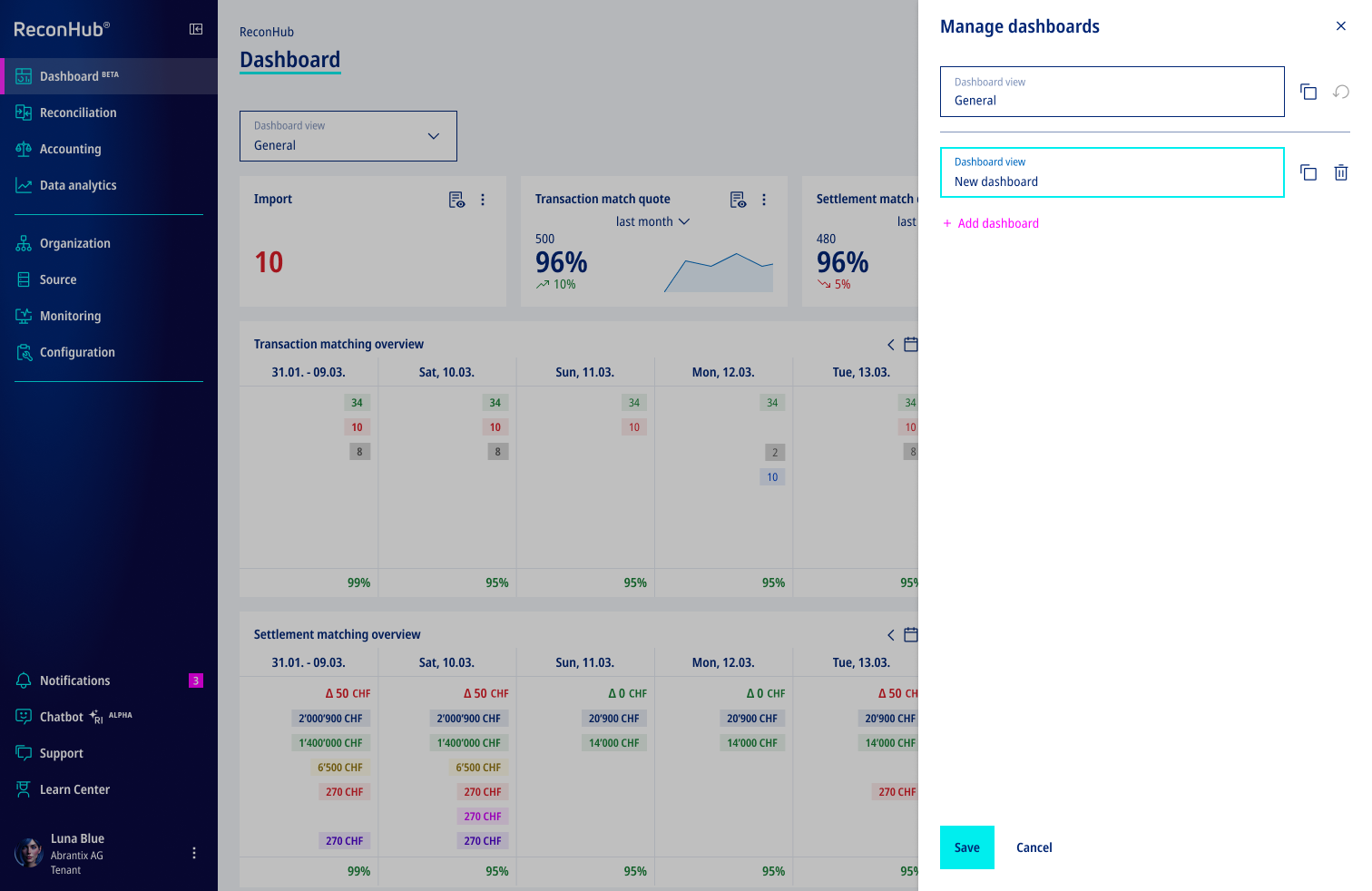 The Dashboard gives you a quick overview of your key reconciliation processes. It helps you monitor imports, matching progress, unmatched items, and financial KPIs—all in one place.
